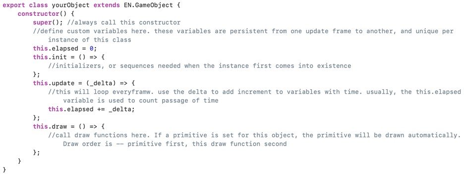 The next step is to create a class with the same name as your .js file, then extend it from EN.GameObject. The structure of the GameObject should look exactly like this: