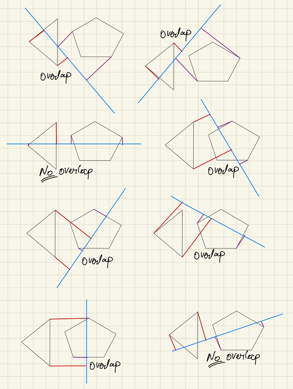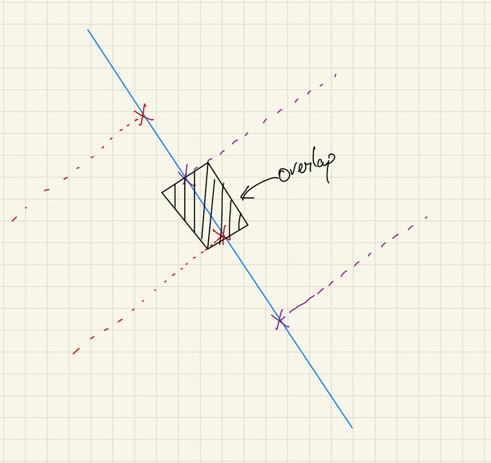 This process of checking for overlaps is repeated for every single axis of both the primitives combined. If a duplicate axis is encountered it may be skipped.