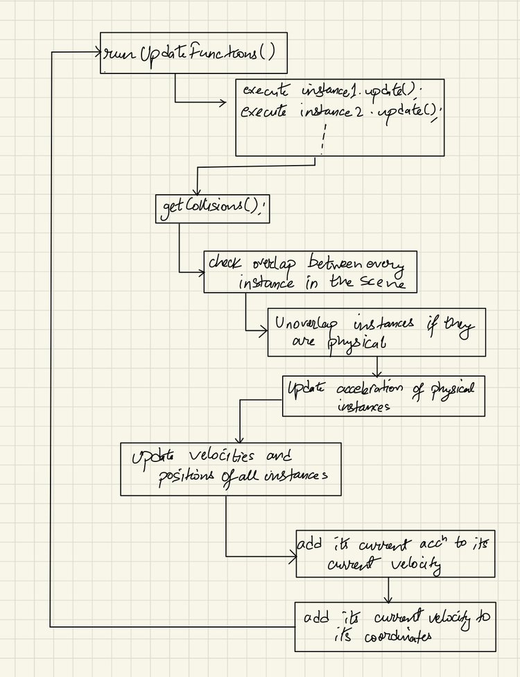 - The function of all instances needs to be called first. For example, this is where the initial acceleration of all physical instances is calculated after their reaction to forces.