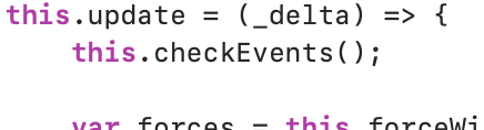 There is a delta variable that can be seen being passed onto the function. The main program loops via a Ticker provided by PixiJS. The delta variable from this ticker is distributed to all instances in the scene to keep track of time. It is this variable that we use to execute time-based actions such as animations or reaction to physical forces. The diagram above also makes clever use of this.elapsed variable by having it count the time value, resulting in the cosine function returning an oscillating value for our animation.