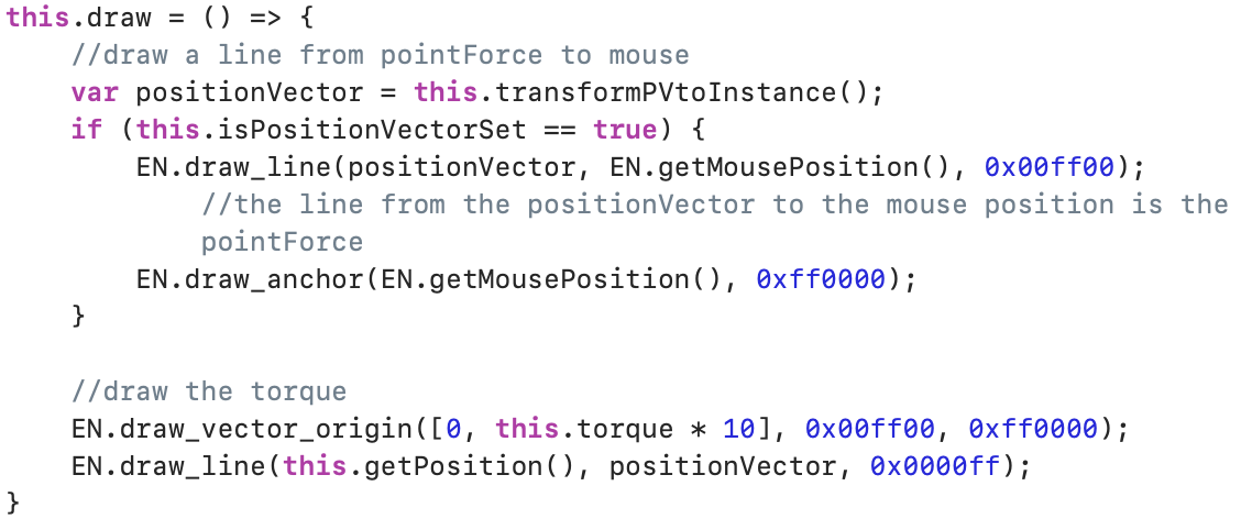 The draw() function is where the Engine will execute the drawing commands from the object. In Laplass, the instances in the scene oversee drawing graphics. The graphics functions are defined in the Engine itself, but they are executed by the instances. Refer to Engine.js and EngineCore.js for details. This function is also what the Engine executes every single frame. You can put update() code in draw(), but it is not recommended in order to keep things simple.